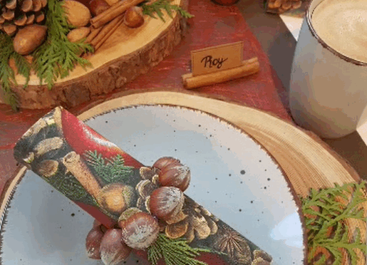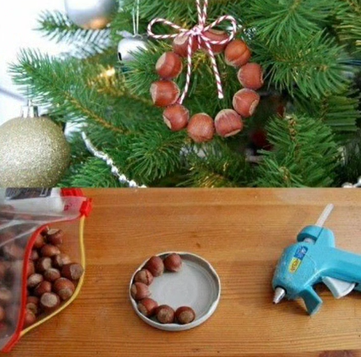 Die Nüsse an den Innenrand des Deckels legen und eines nach dem anderen nacheinander mit Heißleim verkleben, so dass ein Ring entsteht. Den Kleber fest werden lassen und dann den Ring mit einem Band zum Aufhängen verzieren oder als Serviettenring verwenden.