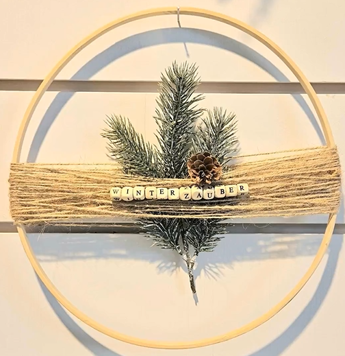 Holzbuchstaben, Zweige, Zapfen, Kordelfaden oder Wollfaden
