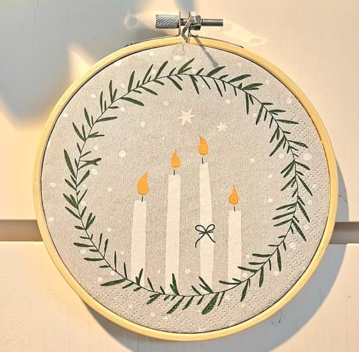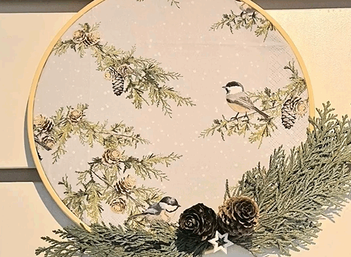 Holzringspannrahmen, Schere, Zapfen, Zweige, Sterne als Deko, Serviette.