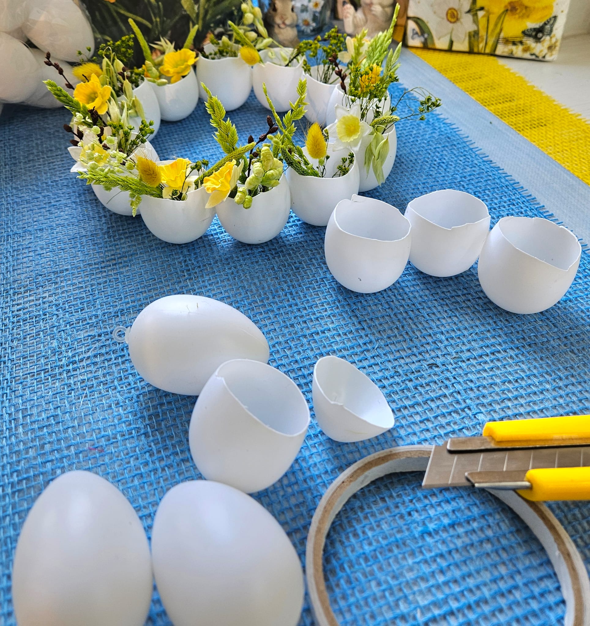 Plastic eggs, craft knife, hot glue gun with glue sticks, decorations