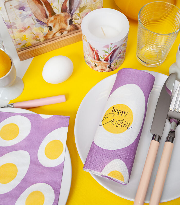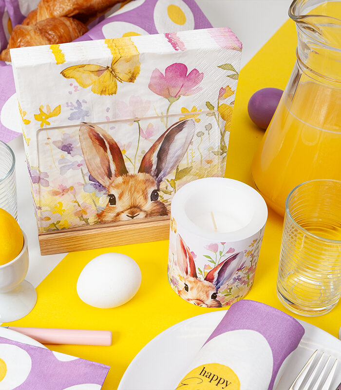 In diesem Jahr präsentieren wir zu unserem Serviettendesign „Bunny in Meadow“ eine neue, kleine Dekorkerze für das Osterfest. Zarte Pastell-Farben mit einem süßen Hasen, kombiniert mit sanften Blumen und einem Schmetterling wirken sehr naturgetreu – perfekt für den Start in den Frühling.